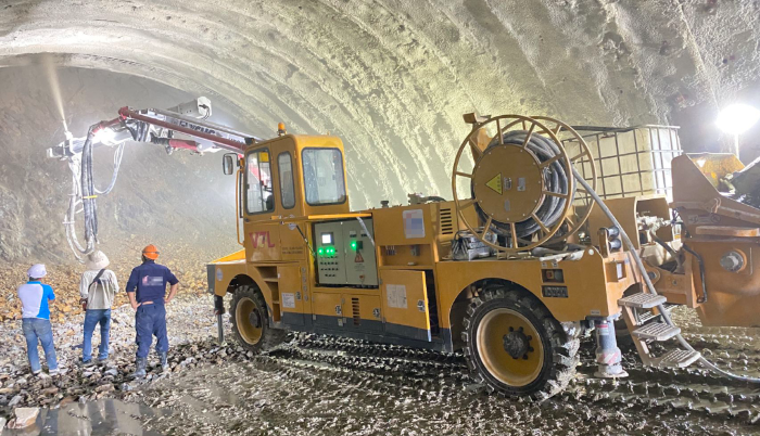 越南某隧道施工現(xiàn)場,三臺徐工混凝土噴漿車正在進行一場“雙向奔赴”式施工。
