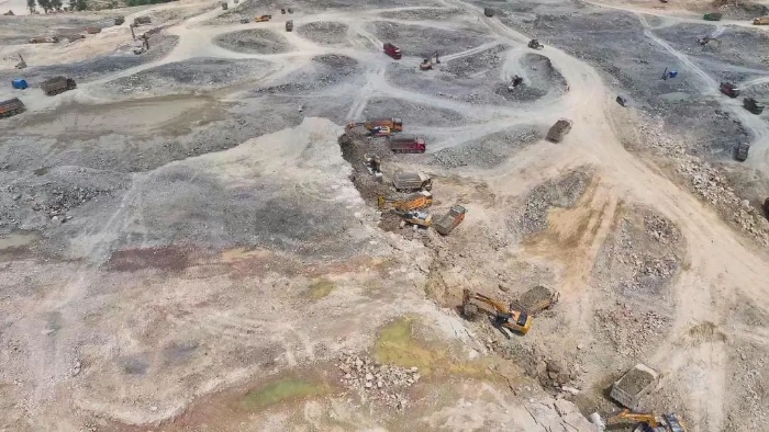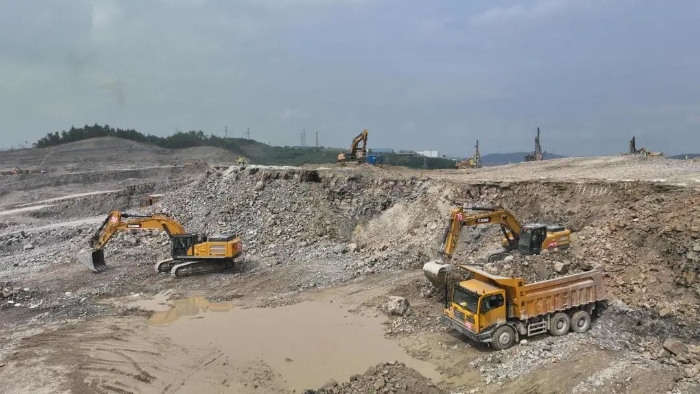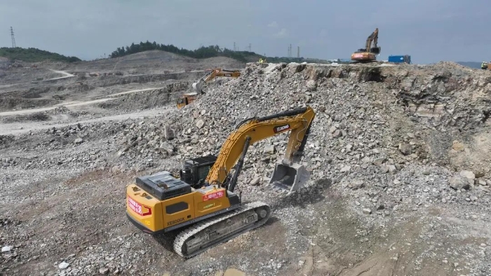 前期爆破剝離工序后,徐工20噸挖掘機(jī)搭配140的小破碎錘進(jìn)行二破,同時(shí)XE380GK、XE600GK等機(jī)型進(jìn)行挖裝作業(yè)?,F(xiàn)場(chǎng)共投入挖掘機(jī)50多臺(tái),每天的挖方量在10萬(wàn)方左右。