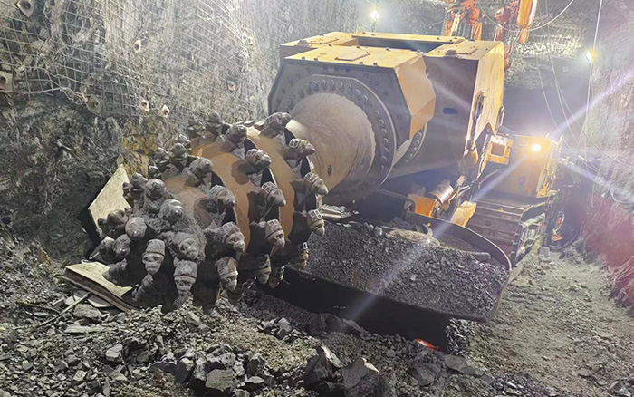該礦施工斷面5m*4.5m,巖層硬度在60MPa左右,客戶所選購的徐工XTR7/360掘進機最大截割高度7.2m,可實現(xiàn)中等斷面隧道一次開挖成型,切割頭配合硬巖截齒,掘進時可以向巖壁施加每平方厘米1.5噸的力量,在機動靈活的基礎(chǔ)上兼具掘進硬巖的優(yōu)勢。