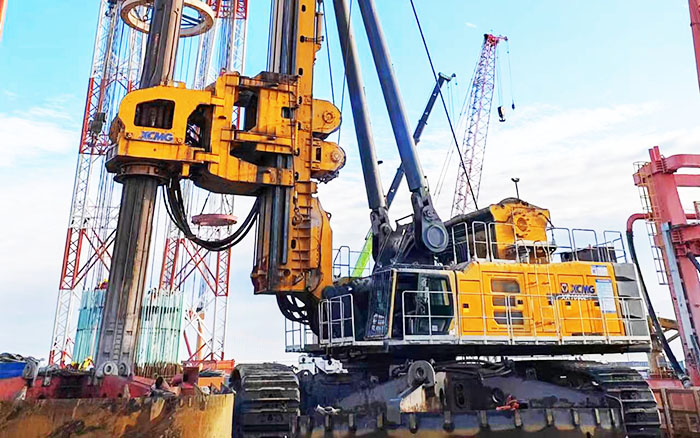 徐工XR1600E旋挖鉆機參建項目為世界上跨度最大的西堠門公鐵兩用跨海大橋,其中5號主塔墩基礎采用18根6.3m鉆孔灌注樁進行承載。XR1600E旋挖鉆機需要在大風、激流、裸巖、深水的復雜海洋環(huán)境下為這座超級跨海大橋進行夯基,完成目前國內最大直徑6.3m的鉆孔施工!