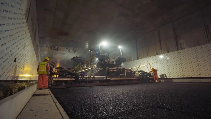 徐工成套高端油面設(shè)備,憑借引領(lǐng)行業(yè)的產(chǎn)品技術(shù)實力,為媽灣跨海通道的道路建設(shè)提供了成套化的高效施工解決方案,確保隧道路面施工作業(yè)圓滿實施。