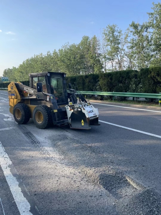 徐工滑移裝載機搭配銑刨器高速公路坑槽病害快速銑刨,預留臺階,便于分層壓實和提升路基結構穩(wěn)定。