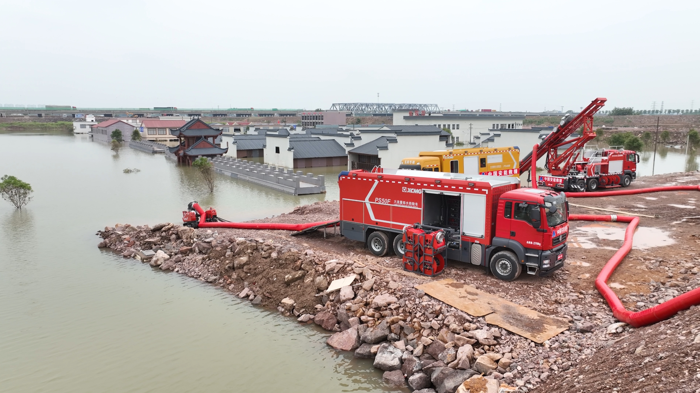 在各類洪澇災害搶險救援中“身經(jīng)百戰(zhàn)”的徐工PS50F子母式排水搶險車、GP35C垂直排水搶險車、PS40B泵組式排水搶險車聯(lián)合應戰(zhàn),充分參與排水搶險項目演練。