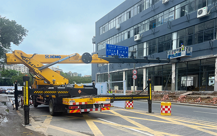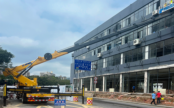 近日,一臺(tái)GKS47高空作業(yè)車化身“大力神手”,現(xiàn)身深圳街頭某新建商鋪街區(qū)對(duì)面,助力商鋪建筑外墻施工及水電線路管道安裝。