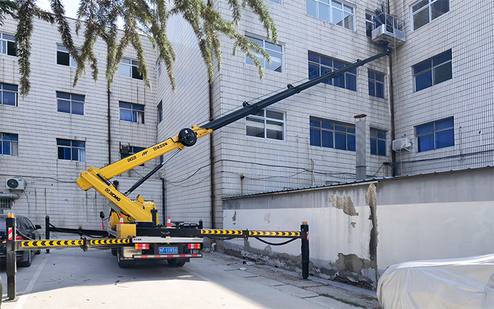 在現(xiàn)場可以看到,GKS28D結(jié)構(gòu)緊湊,整車尺寸小,能在小區(qū)狹窄道路內(nèi)穿梭自如;作業(yè)斗將鋼架物料和一名施工人員平穩(wěn)快速運送至起始作業(yè)點位,從右至左依次安裝鋼架,設(shè)備作業(yè)幅度覆蓋整排樓體外立面,可輕松到達指定位置;同時,無線遙控器能夠幫助檢修人員“無死角”觀察到作業(yè)平臺位置,大大提高了移動效率和精準度。