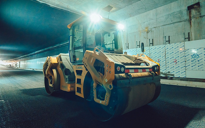 某隧道數(shù)字化智能施工是國內(nèi)首次在城市地下長隧道中進行無人攤鋪、壓實新工藝應(yīng)用。擔任壓實工作的也正是徐工XD135TIV壓路機,在狹窄的作業(yè)空間內(nèi)展現(xiàn)出強大的施工能力。它的起步平緩和停車平穩(wěn)的設(shè)計,有效避免了路面堆料和擁包現(xiàn)象,確保了每一段路面的高質(zhì)量壓實,節(jié)省了大量時間和成本。