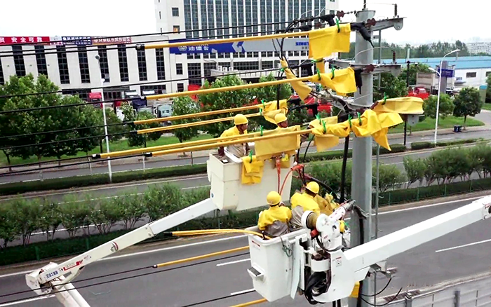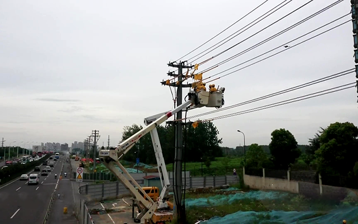 在電力桿線遷改施工現(xiàn)場,4名帶電作業(yè)人員嚴格做好安全措施后,穿上黃色的絕緣服,乘坐徐工GKJH21絕緣斗臂車升入高空,將跨滁河大橋上的原10千伏泗水04線上電纜與架空線連接引線斷開,為當日連接新建線路做準備。整個施工過程高效、安全、平穩(wěn),獲得現(xiàn)場施工負責人的認可。