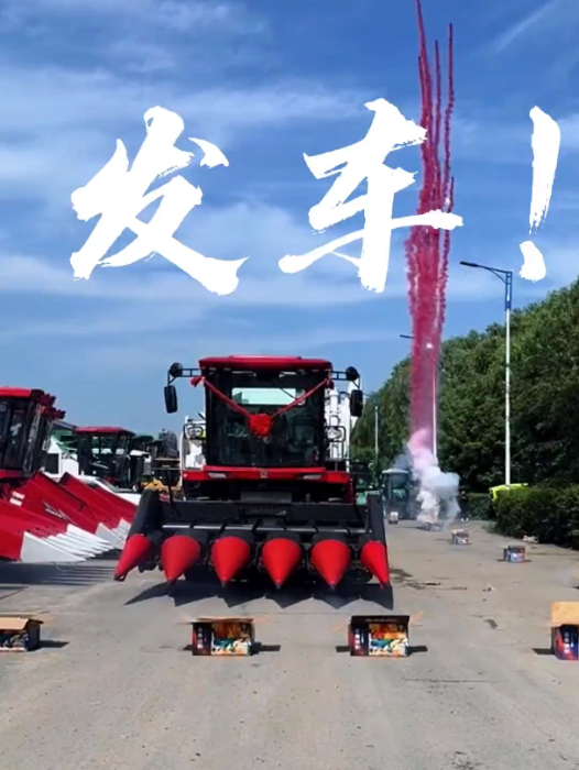 提車現(xiàn)場(chǎng),禮花鞭炮齊鳴,身披大紅花的玉米收獲機(jī)整齊排列,一臺(tái)接一臺(tái)奔赴田間地頭,即將逐夢(mèng)沃野,繪就豐收?qǐng)D景。