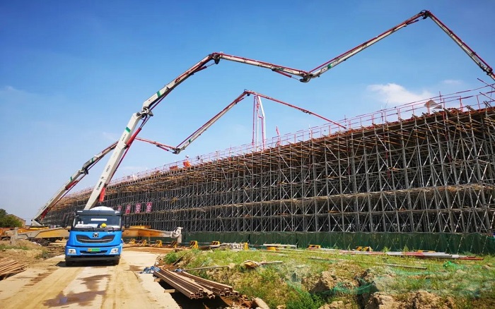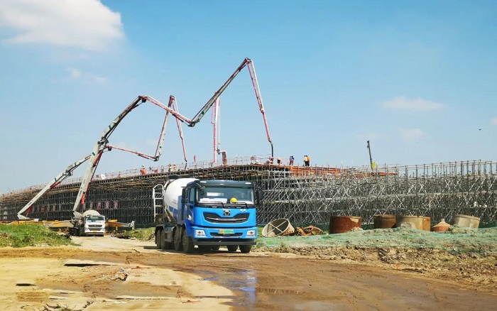 驕陽(yáng)灼灼,機(jī)械轟鳴。近日,在江蘇省重點(diǎn)交通建設(shè)工程-江陰靖江長(zhǎng)江隧道建設(shè)現(xiàn)場(chǎng),徐工泵車(chē)及純電動(dòng)攪拌車(chē)多機(jī)合作,憑借先進(jìn)技術(shù)和優(yōu)越性能,圓滿(mǎn)完成橋面混凝土澆筑任務(wù)。