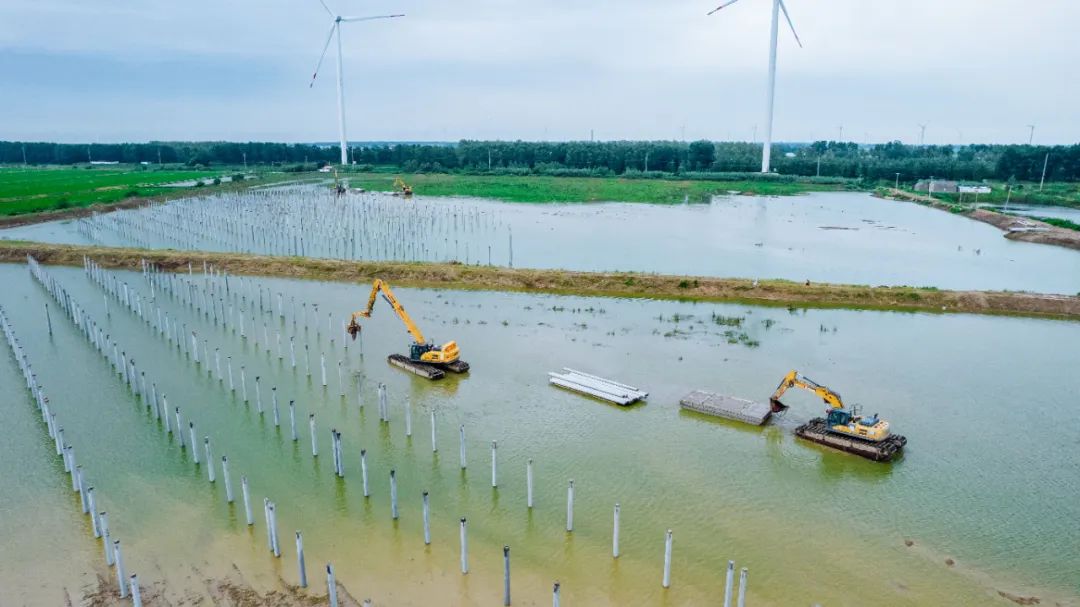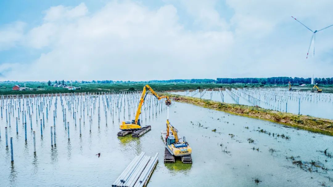 在漁業(yè)較為發(fā)達(dá)的濱海港鎮(zhèn),“漁光互補(bǔ)”光伏發(fā)電項(xiàng)目建設(shè)正如火如荼,項(xiàng)目現(xiàn)場(chǎng),徐工水上打樁機(jī)的身影隨處可見。