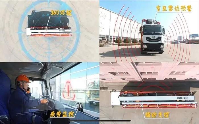 車身同時配有盲區(qū)雷達(dá)預(yù)警、360環(huán)視等輔助駕駛系統(tǒng),提升泵車駕駛安全系數(shù),行車更安心。