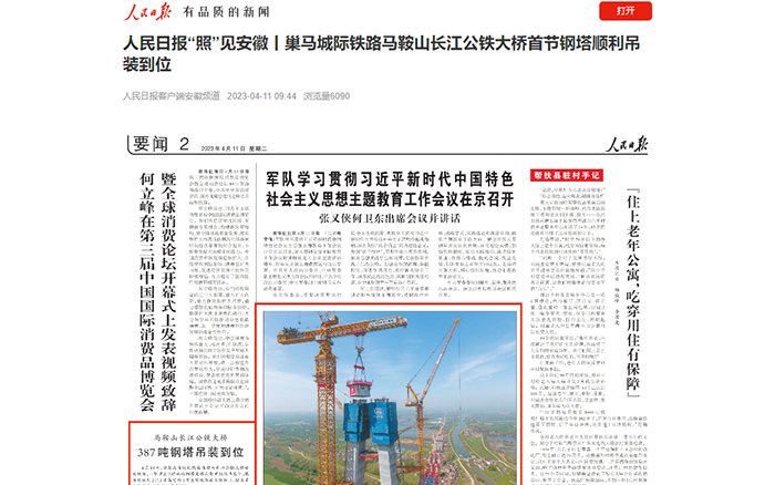 首節(jié)鋼塔吊裝過程獲得《新聞聯播》《東方時空》《人民日報》《央視新聞》、CCTV4、中國新聞網、新華報業(yè)網、《新民晚報》、安徽網、荊楚網、齊魯網、高鐵網、《馬鞍山日報》等多家央省級主流媒體集中跟進報道,引起廣泛關注。