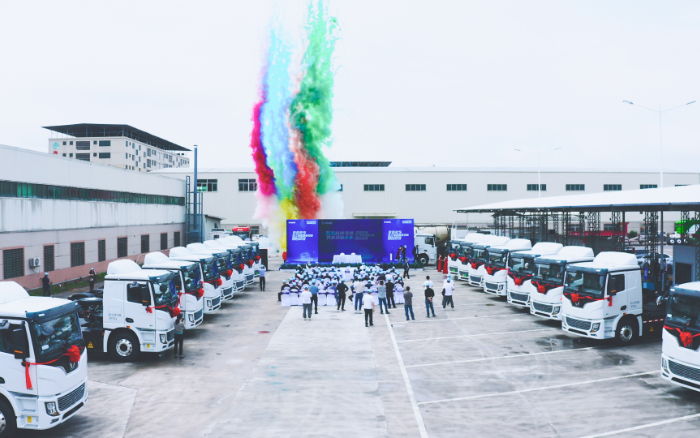 近日,百臺(tái)徐工新能源重卡交付儀式在“世界客都”——廣東梅州如期舉行,助力當(dāng)?shù)厣笆?、水泥輔料及煤炭運(yùn)輸??蛻艏靶旃て嚧淼劝儆嗳藚⒓踊顒?dòng)。