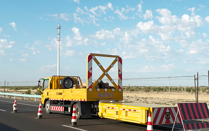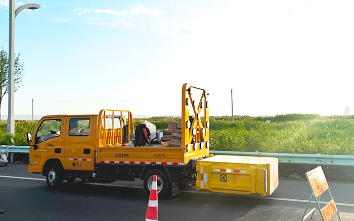 不光是安全衛(wèi)士,它們還是高效的 “移動(dòng)倉(cāng)庫(kù)”。貨箱敞開(kāi)著,里面整齊碼放著鐵鍬、瀝青、警示錐等施工所需的工具和材料。施工時(shí),人員無(wú)需來(lái)回奔波取物,伸手就能拿到需要的東西,讓施工節(jié)奏得以加快,省去了不少麻煩。當(dāng)施工收尾,防撞緩沖車(chē)駛離后,留下的不僅是平整的路面,更有它們?yōu)檫@次施工全程護(hù)航的印記。