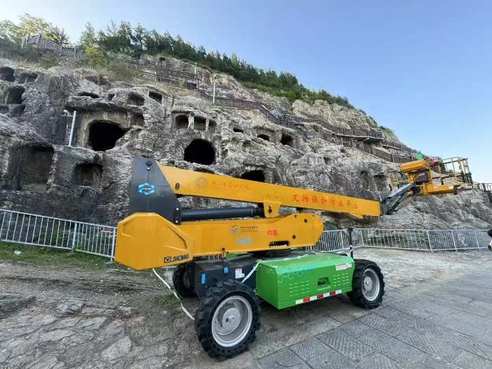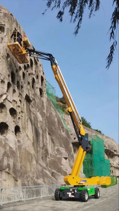 時間回溯到2021年,由于遭受多場暴雨侵襲,龍門石窟部分洞窟內(nèi)滲漏水嚴(yán)重甚至出現(xiàn)積水,部分山體表面巖石脫落、松動,嚴(yán)重威脅文物安全,急需得到有效治理。龍門石窟研究院隨即開展了為期1年多的“龍門石窟蓮花洞至石牛溪區(qū)域保養(yǎng)維護(hù)項目”。徐工XGS25ACK-Li直臂式高空作業(yè)平臺作為“得力助手”,深度參與各項保護(hù)修復(fù)工作。