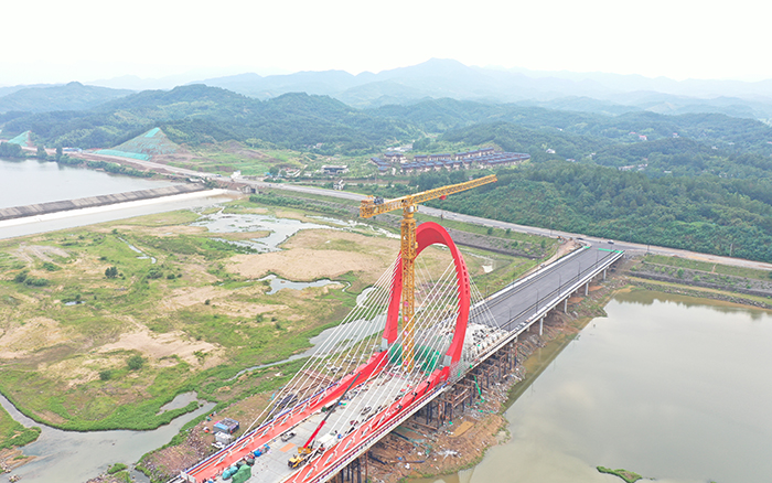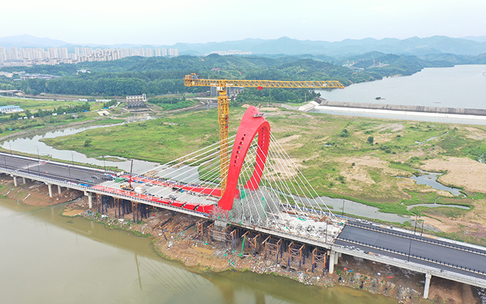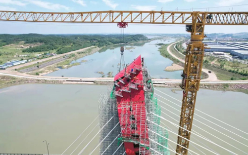 在大別山腹地、金寨縣史河河畔,“紅色搖籃”傲視遠(yuǎn)方,徐工XGT2230-100S塔機揮舞著巨臂,隨著重達(dá)40噸的主橋鋼塔柱最后一個節(jié)段起吊安裝到位,金寨史河大橋主塔順利合龍。