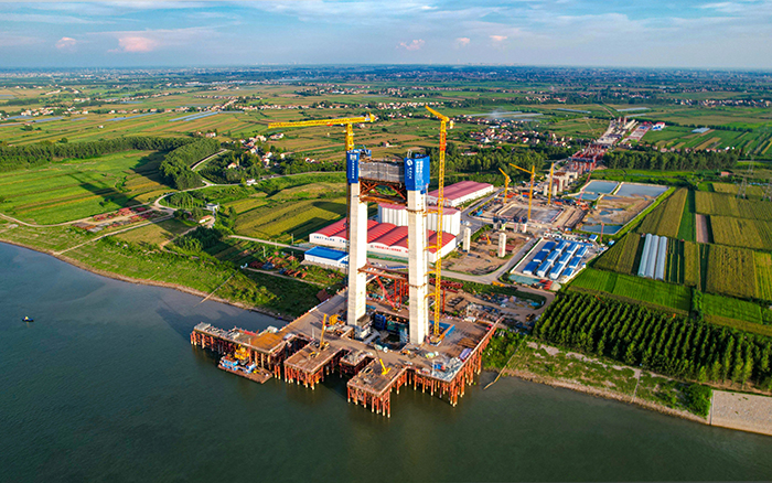 初秋時節(jié),長江之畔,兩臺徐工XGT600A-25S塔機(jī)鐵臂揮舞,助力荊州李埠長江公鐵大橋南岸主塔下游側(cè)第18節(jié)塔柱順利完成澆筑。