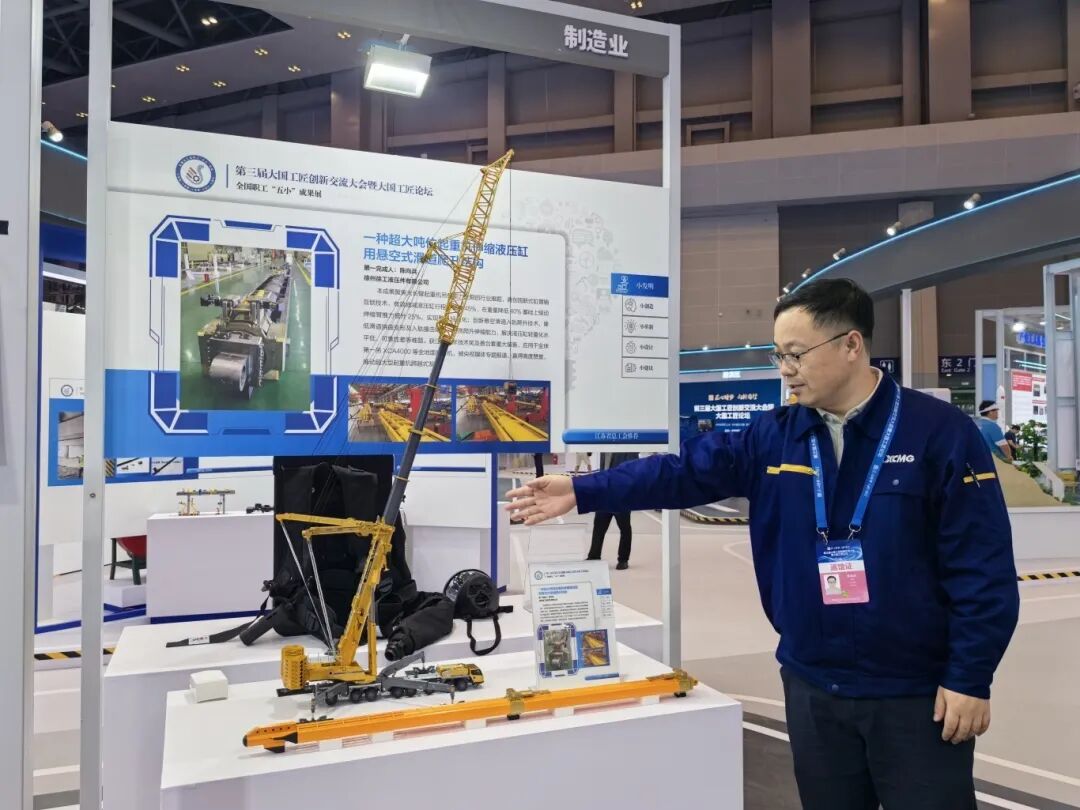 以匠心致創(chuàng)新,徐工人在攻克核心難題上從不缺席。徐工液壓事業(yè)部陳向兵完成的“一種超大噸位起重機(jī)伸縮液壓缸用懸空式滑道爬升結(jié)構(gòu)”亮相全國(guó)總工會(huì)“五小”成果展區(qū)。
