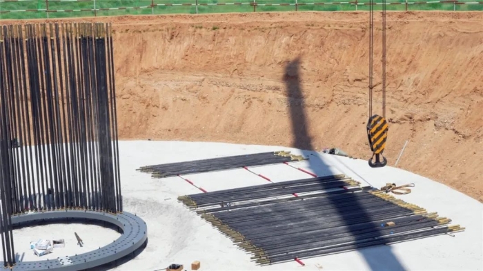 此次進行的是風(fēng)電基礎(chǔ)吊裝,重達17噸的鉚盤穩(wěn)落在基坑,214根鉚桿密集插裝,每一根都必須精準(zhǔn)插入孔位。